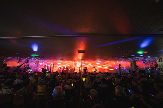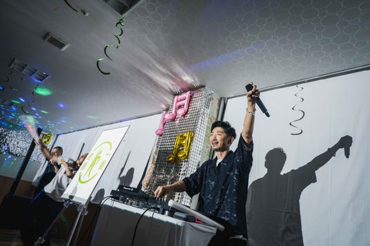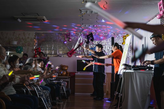 ロマンディスコとは介護福祉士かつDJの大滝亮輔氏とRIP SLYMEのSU氏が、介護施設などで高齢者向けのディスコイベントとして実施しているものです。光に彩られた非日常空間に、昭和から令和のヒット曲が流され、スクリーンには昔の街並みや、若い頃の自分たちの姿が投影されることで、当時を思い出しながら一緒に歌ったり、音楽に合わせてペンライトを振ったり、体を動かすなど、楽しみながら健康増進を図るイベントです。