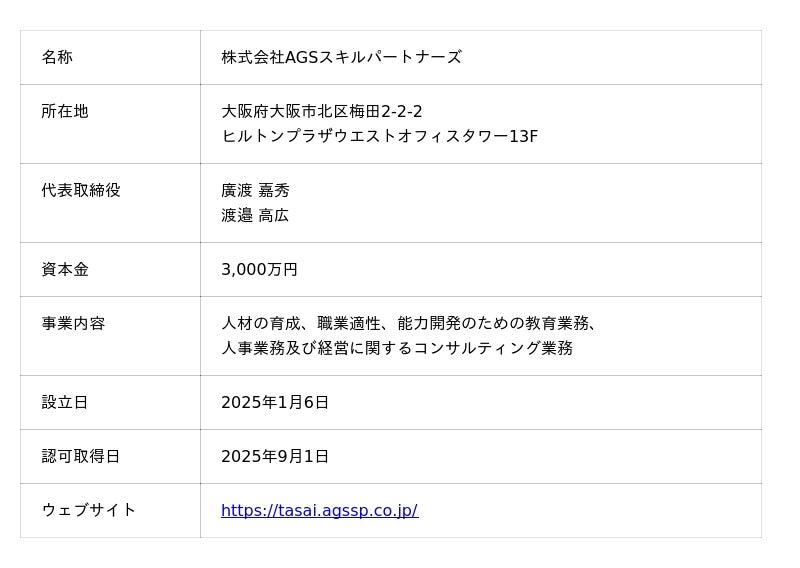 AGSグループの株式会社AGSスキルパートナーズ(本社:大阪市北区、代表取締役:廣渡嘉秀、渡邉高広)は、2025年9月1日より、経営者を支える経営管理人材候補を育成・紹介する新サービス「TASAi」をスタートしました。「TASAi」をとおして、人材不足が深刻化するなか、「経営視点を持つ人材が見つからない」「右腕となる人材が育たない」と悩む中小企業の声に応えていきます。