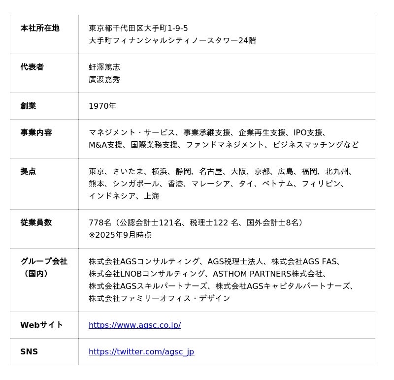 株式会社AGSコンサルティングとAGS税理士法人を中核とする、日本発の独立系、総合型アカウンティング・ファームです。公認会計士121名、および税理士122名(2025年9月現在)を擁し、「誰よりも身近な専門家」として、法人4,100社、個人1,900名のスタートアップから上場企業までの幅広いお客様に対して、税務・会計、IPO・M&A・企業再生等の支援サービス、国際税務・会計顧問や海外進出・撤退を支援する国際業務などを提供しています。日本経済を支える企業の経営に役立つことを信念とし、日本発のアカウンティング・ファームとして一番になることを目指しています。