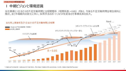 2007 年の創業以来、顧客側に立脚した独自のビジネスモデルである「コンサルティング×RPO(採用代行)」で、各産業における国内大手企業の採用課題を解決してきました。少子高齢化・人口減少による労働力の減少が社会課題となる中で、2030 年の労働需給 GAP 解消を掲げる当社にとって非常に重要となる5 年間を迎えます。ここに向けた中期経営計画を開示する事は、我々の VISON である「採用市場のインフラになる」を体現し、日本の労働需給ギャップに圧倒的な解決策を提示します。