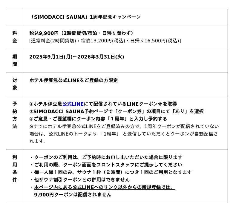 キャンペーン期間中は、ホテル伊豆急公式LINEをご登録の方限定で、「SIMODACCI SAUNA」のご利用が通常、御宿泊者13,200円(税込)・日帰りで16,500円(税込)のところ、宿泊・日帰り問わず9,900円(税込)でご利用いただけます。