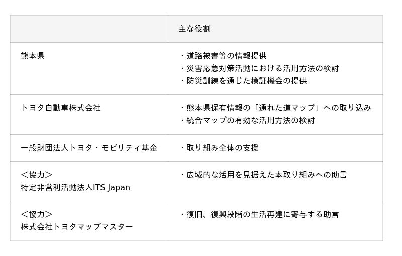 今後、「くまもと通るモン!プロジェクト*1」の名称のもと、車両通行実績や地図情報を活用し、災害時の対応力を高めるためのデータ活用の方法を検討していきます。