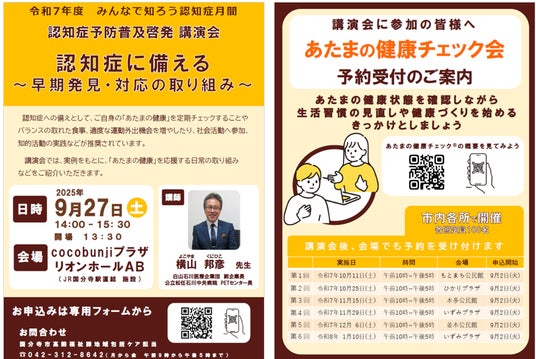 備考: 講演終了後には、10月以降に市内各所で開催の「あたまの健康チェック」検査会の