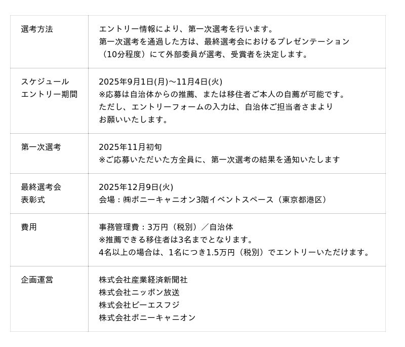人口減少と高齢化が進み、地域の担い手不足が深刻化する中、新たな風を吹き込む存在として「移住者」に注目が集まっています。新たな地に可能性を見いだし、自らの理想の暮らしを実現する移住者たちの挑戦と地域への貢献をたたえ、その歩みを広く発信するため、「第2回ニッポン移住者アワード」を開催します。最終選考会は12月9日(火)に開催いたします。エントリーの受付は9月1日(月)からです。