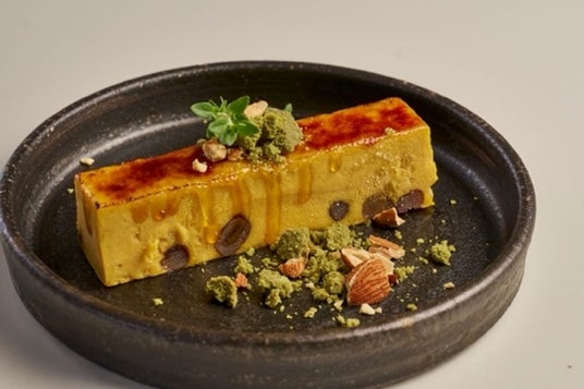 表面をパリッと香ばしくキャラメリゼし、スプーンを入れると中からとろけるようなかぼちゃクリームが顔をのぞかせる濃密な甘さのデザートです。なめらかな口どけと濃厚な甘みは、食後を豊かに彩るのにぴったり。見た目も鮮やかな秋色で、ハロウィンシーズンの特別なデザートとしてテーブルを華やかに演出します。