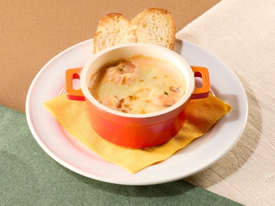 甘酸っぱいりんごのコンポートとほろ苦い塩キャラメルソース、優しい甘さのバニラアイスがマッチする、秋にぴったりのココッシュです。ココッシュからほんのり香るバターの風味に、りんごの爽やかな味わいと塩キャラメルソースのコクがマッチします。