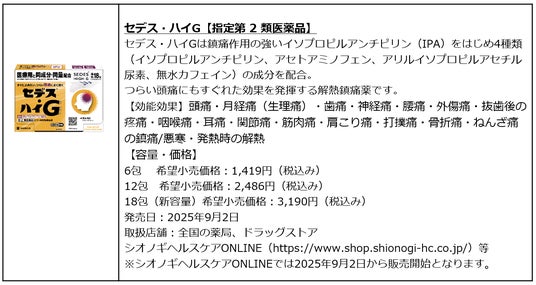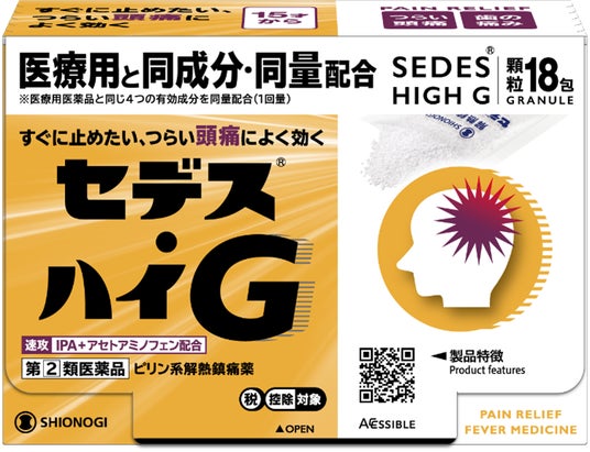 ヘルスケア価値の提供を通じて社会に貢献するシオノギヘルスケア株式会社(本社:大阪府大阪市、代表取締役社長:中川 ゆう子、以下、シオノギヘルスケア)は、「セデス・ハイG」(指定第2類医薬品)から新容量の18包を2025年9月2日(火)より販売開始いたします。「セデス・ハイG」は医療用と同じ有効成分を同量配合したピリン系の解熱鎮痛薬です。すぐに止めたい、つらい頭痛によく効きます。