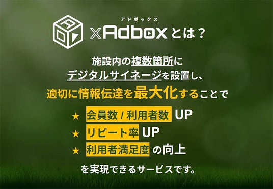 「GOLF xAdbox」は、施設内に無償でサイネージを設置し、来場者へ効果的に情報発信することで、新規会員獲得・利用者数増加・リピート率向上を実現するゴルフ場様向けのサービスです。