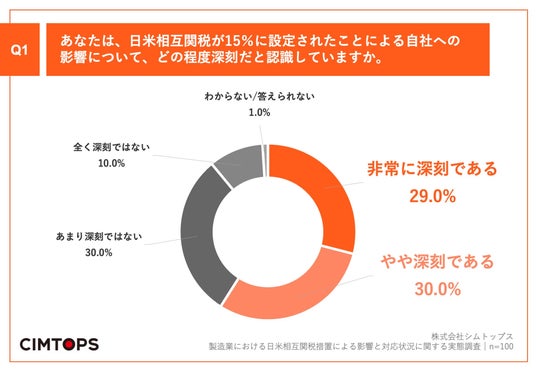 「Q1.あなたは、日米相互関税が15%に設定されたことによる自社への影響について、どの程度深刻だと認識していますか。」(n=100)と質問したところ、「非常に深刻である」が29.0%、「やや深刻である」が30.0%という回答となりました。