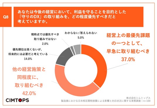 ■今後の経営において、利益を守ることを目的とした「守りのDX」の取り組みについて、37.0%が「最優先課題として」、42.0%が「他の経営施策と同程度に」取り組むべきと回答