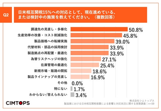 Q1で「非常に深刻である」「やや深刻である」と回答した方に、「Q2.日米相互関税15%への対応として、現在進めている、または検討中の施策を教えてください。(複数回答)」(n=59)と質問したところ、「調達先の見直し・多様化」が50.8%、「生産効率の改善・コスト削減強化」が45.8%、「製品価格への転嫁実施」が39.0%という回答となりました。