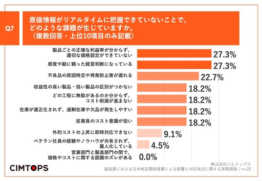 Q4で「あまり把握できていない」「全く把握できていない」と回答した方に、「Q7.原価情報がリアルタイムに把握できていないことで、どのような課題が生じていますか。(複数回答)」(n=22)と質問したところ、「製品ごとの正確な利益率が分からず、適切な価格設定ができていない」が27.3%、「感覚や勘に頼った経営判断になっている」が27.3%、「不良品の原因特定や再発防止策が遅れる」が22.7%という回答となりました。