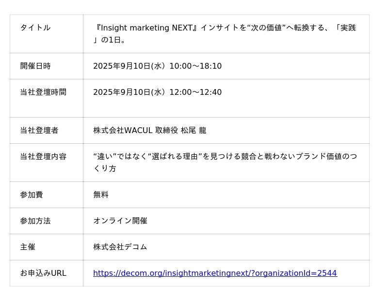 2025年9月10日開催のカンファレンス「『Insight marketing NEXT』インサイトを“次の価値”へ転換する、「実践」の1日。」にWACULが登壇します。