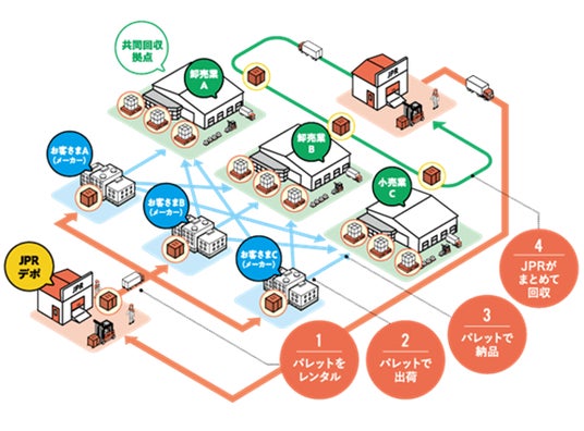 JPRレンタルパレットサービスは標準規格化されたパレットを複数の企業が共有することで、効率的な「一貫パレチゼーションを」実現する社会的なシステムです。