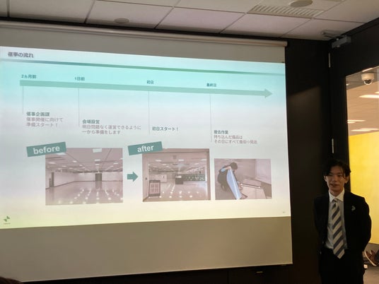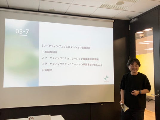 まず、管理部より弊社の生い立ちやMVV、ブランドプロミス「想いによりそうパートナー(以下「想パ」)」などの会社説明をいたしました。その後、豊洲オフィスにて懇親会のランチが行われました。また、部長陣から各部署の概要や各部のMVVに対する想いをご説明し、全社理解をより深めました。