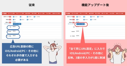 従来、広告のURLを設定する際は、デバイスごと(「iOS」「Android」「PC」)に同じ広告URLを3回入力して登録するという手間のかかる作業がありました。