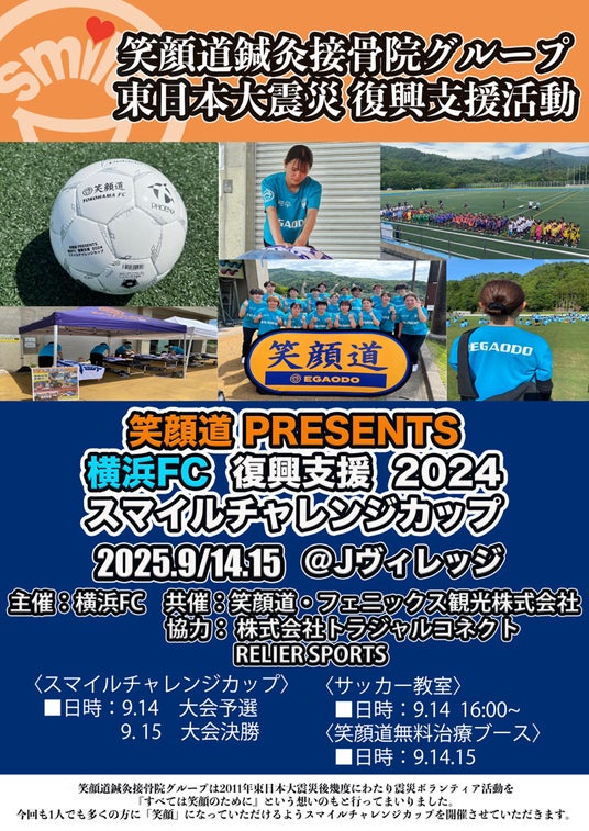 この度、株式会社爽健グローバル (本社:東京都新宿区、代表取締役:福田秀人、以下爽健グローバル)が運営する「笑顔道鍼灸接骨院グループ」は、2025東日本大震災復興支援活動として株式会社横浜フリエスポーツクラブ(本社:神奈川県横浜市、代表取締役社長COO:片原 大示郎)が運営するプロサッカーチーム「横浜FC」、フェニックス観光株式会社、株式会社トラジャルコネクト、RELIER SPORTSと共に「笑顔道PRESENTS横浜FC復興支援 2025 スマイルチャレンジカップ」を開催いたします。