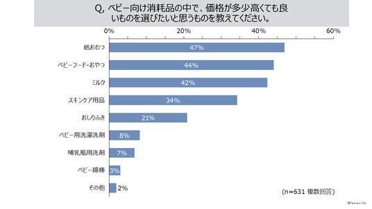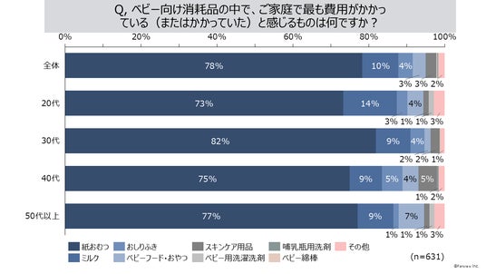2.ベビー向け消耗品の中で最も費用がかかっていると感じるものは「紙おむつ」78%、価格が多少高くても良いものを選びたい