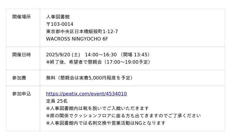 【9/20(土)】「HRBPについて語る会」 “事業と人事の橋渡し“のリアルを探るイベントを開催|東京人形町@人事図書館