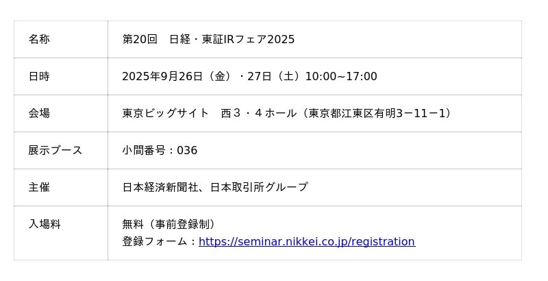 日経・東証IRフェアは日本経済新聞社が主催するIRイベントで、20回目を迎える今回は、日本取引所グループと共催で開催します。