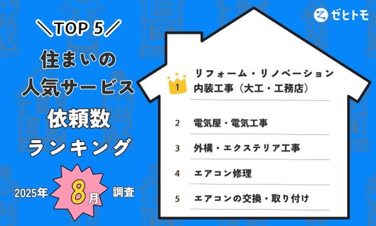 くらしのマッチングサービス「ゼヒトモ」を提供する株式会社Zehitomo(本社:東京都品川区、代表取締役:三浦雄一郎、以下「当社」)は、2025年8月に多くの依頼が寄せられた住宅関連サービスカテゴリのTOP5を発表いたしました。