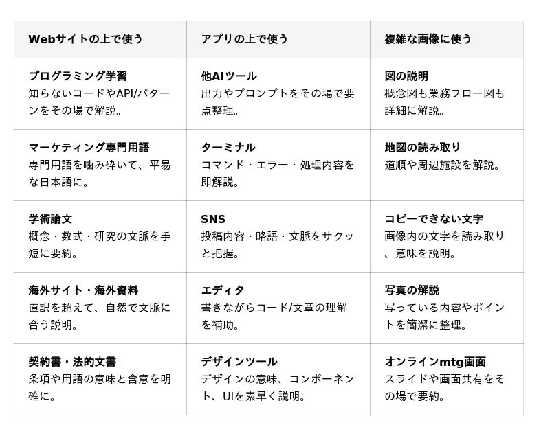 ウェブサイト、ドキュメント、アプリで出会った難しいテキストも、画像やグラフなどの視覚コンテンツも、範囲を選んですぐに解説されます。