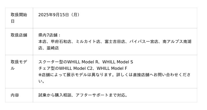 MNホールディングス株式会社傘下の甲斐日産自動車株式会社(本社:山梨県甲府市、代表取締役社長:長澤拓真、以下「甲斐日産」)と同じく傘下でレンタカー事業を展開するレンタルギア山梨株式会社(本社:山梨県甲府市、代表取締役社長:長澤一真、以下「レンタルギア山梨」)は、WHILL株式会社(本社:東京都品川区、代表取締役社長 CEO:杉江理、以下「WHILL社」)と地域・業界を横断した連携を通じ、免許・ヘルメット不要で歩行領域を走行する近距離モビリティWHILL(ウィル)の網羅的な取り扱いを2025年9月12日より開始することを発表いたします。販売に加え、レンタカー事業においてもウィルを山梨県で初導入することで、日常・非日常のあらゆる場面において「徒歩」をカバーする安心快適な移動環境を構築する狙いです。高齢化や旺盛なインバウンド需要などに伴う多様化が加速する中、年齢や国籍、身体状況などにかかわらず誰もが移動しやすいモビリティ社会づくりにも貢献いたします。