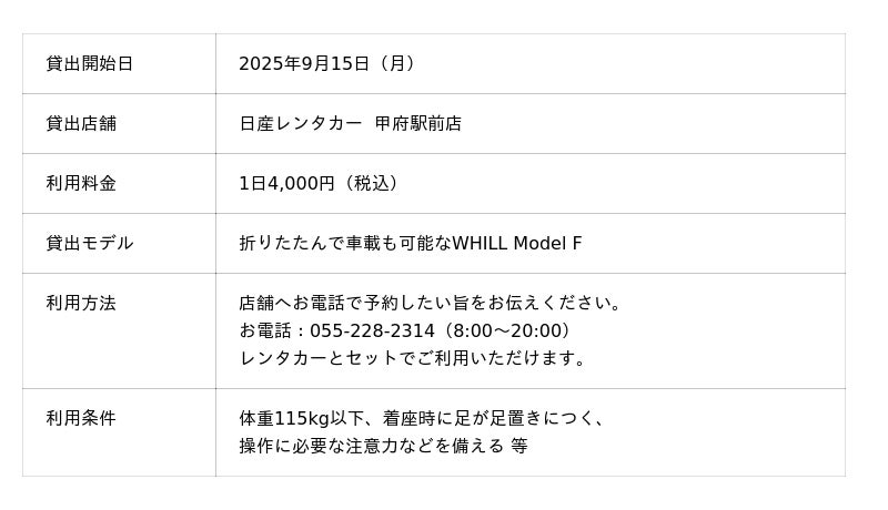 同時に、レンタルギア山梨ではコンパクトに折りたためる「WHILL Model F」を導入し、日産自動車系列レンタカー会社では初となる貸出サービスを展開します。高齢化が進む中でも「レンタカーを降りた先でも、自分のペースでその場でのひとときを満喫したい」「移動に不安を抱える家族を気軽に誘いたい」といった声や、毎日は乗らないけれど必要なタイミングで一時的に利用したいとのニーズに柔軟に寄り添う形です。