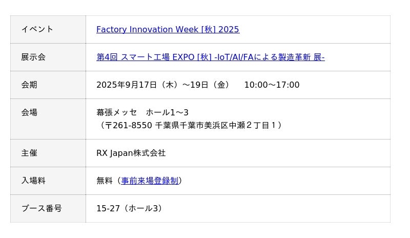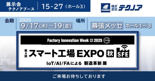 株式会社テクノア(本社:岐阜県岐阜市、代表取締役:山崎 耕治)は、9月17日~19日に幕張メッセで開催される「Factory Innovation Week [秋] 2025」に出展いたします。