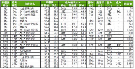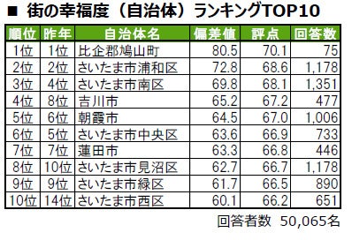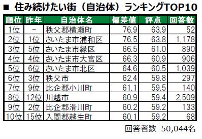 1位は初登場の秩父郡横瀬町で、昨年は累計回答者数が50名未満でランキングの集計対象外だった町です。2位はさいたま市浦和区、3位はさいたま市緑区です。トップ10のうち4自治体が、郡部に属する「町」です。