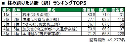 1位は熊谷市に位置する石原で、唯一偏差値80台の極めて高い評価を得ています。石原は、昨年は累計回答数が30名未満でランキング集計対象外だった駅です。2位は2年連続でさいたま市浦和区に位置する浦和で、「住みここち」をはじめとする全てのランキングでトップ4以内に入る高い評価を得ています。3位は、比企郡滑川町に位置するつきのわです。