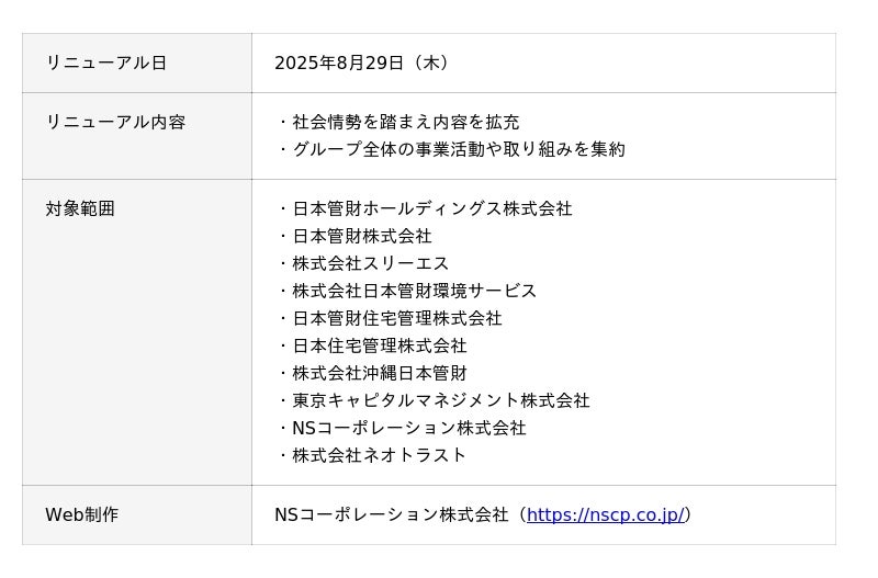 オフィスビルや商業施設等の建物管理運営事業や住宅管理運営事業、不動産ファンドマネジメント事業等を手掛ける日本管財ホールディングス株式会社(本社:東京都中央区、代表取締役社長:福田 慎太郎、以下「当社」)は、2025年8月29日(金)、公式ホームページ内のサステナビリティページをリニューアルしました。