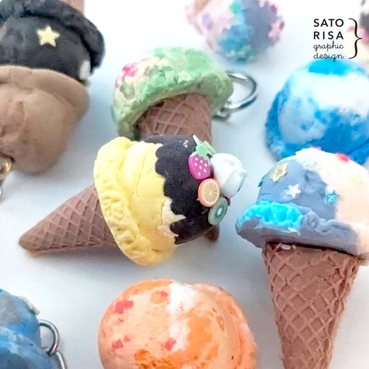 ずらりと並んだアイスはまるで本物のお店のよう。たくさんのフレーバーから好きな味をえらんだら、自由にトッピングをのせていきます。ぜひ、素敵なトッピングで自分だけのアイスクリームキーホルダーを作ってみてください。