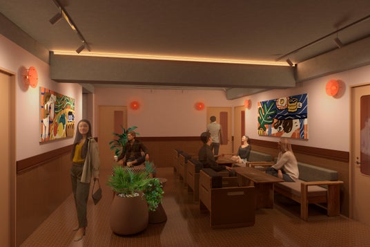 当施設の、ラウンジアートはイラストレーターのオカタオカ氏が手掛け、幡ヶ谷の街並みや本施設をイメージしたアートワークが各階のラウンジ空間を彩ります。