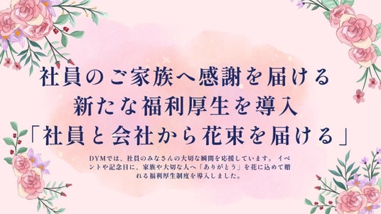 WEB事業や人材事業、海外医療事業等を行う株式会社DYM(読み:ディーワイエム、本社:東京都品川区、代表取締役社長:水谷佑毅)は、新卒社員の入社後3ヶ月にあわせ、花キューピット株式会社が提供するサービス「初任給で花束を」を利用し、新卒社員が日頃の感謝を込めてご家族へ花束を贈る福利厚生を導入しました。