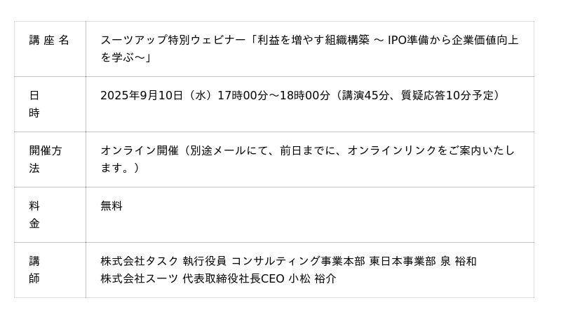 株式会社スーツ(所在地:東京都千代田区、代表取締役社長CEO:小松 裕介)は、2025年9月10日(水)17時から、ゲスト講師に、株式会社タスク 執行役員 コンサルティング事業本部 東日本事業部 泉 裕和氏を迎え、第16回となるスーツアップ特別ウェビナー「利益を増やす組織構築 ~ IPO準備から企業価値向上を学ぶ~」を無料開催します。