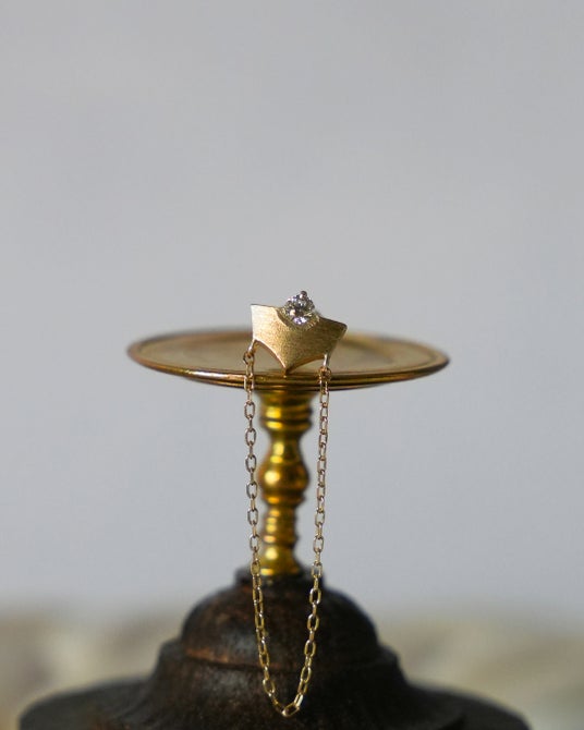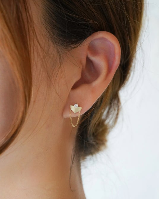また、新作ピアスは片耳にお付けいただくスタイルを提案。ネックレスとお揃いのパーツに華奢なチェーンを加え、チェーンのゆらめきが表情をよりいっそう魅力的に映し出します。なお、チェーンの長さは2種類ご用意しております。