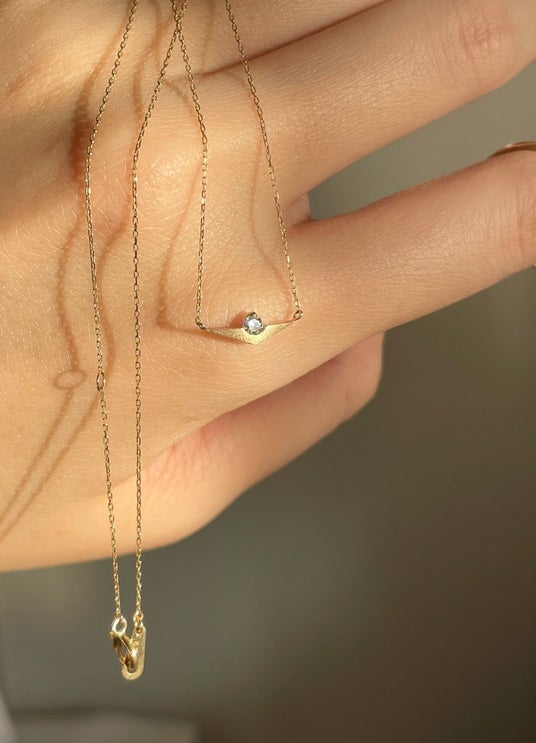 現行の「サンセットネックレス」ネックレスはシンプルな形ながら凛とした魅力が生み出されます。また、重ね付けがしやすく、オリジナリティのあるコーディネートを楽しみたい方にも重宝します。
