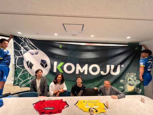 吉祥寺にある本社に訪問し、新たに背面上部に企業ロゴの入った公式ユニフォームをお渡しさせていただき、応援メッセージを頂きました。この契約により、クラブのユニフォームパートナーとしてのサポートのみならず、今後は株式会社DEGICA様が提供する決済端末「KOMOJUターミナル」を導入させて頂き、横河武蔵野FCの試合会場で、当日券やクラブグッズ等をクレジットカードでのオンライン決済でご購入頂けます。