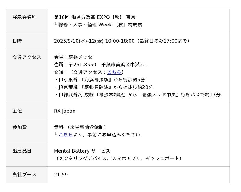 【Mental Batteryサービス】「働き方改革EXPO 2025 東京展【秋】」 in 幕張メッセ(9/10-12)出展
