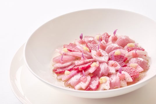 渦巻きビーツや赤大根などのカラフルな野菜で"桜のペタル(花びら)"を模り、柚子とリュバーブのクーリを添えた華やかな一皿。"ペタル"の下には、レモンが香るヨーグルト、ズワイ蟹、野菜のジュレを重ねました。様々な食材の旨味や食感と、お皿の中で桜が咲き誇るような美しさをご堪能ください。