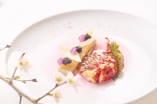 "オマール海老の最高峰"とも言われるオマールブルーを使った贅沢な一品。エルダーフラワーのリキュールを加えたビスクソースには、シャンパンの泡に見立てた、同店特製の"シャンパンボール"も添えて華やかに。様々な調理法のホワイトアスパラガスの付け合わせが、春の訪れを感じさせるメニューです。