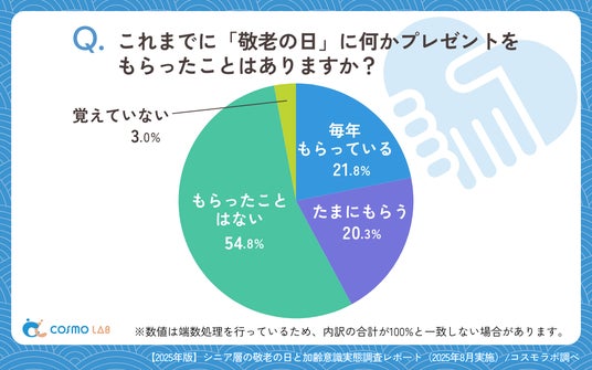 「もらったことはない」(54.8%)が過半数を占め、「毎年もらっている」(21.8%)と、「たまにもらう」(20.3%)を大きく上回っています。「覚えていない」(3.0%)も存在し、敬老の日の贈答習慣は限定的です。過半数がプレゼントを受け取った経験がない結果は、敬老の日が商業的には注目されているものの、実際の家族間でのやり取りとしては定着していない現実を示しています。