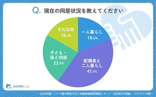 シニア専門のマーケティングプラットホーム コスモラボ(会社名:コスモヘルス株式会社、本社:東京都港区、代表取締役社長 小塚 崇史)がシニア層の『敬老の日』に関するアンケートリサーチのレポートをリリースしました。本レポートでは、50歳以上のシニア層を対象に「敬老の日」や加齢意識に関する意識と実態調査を実施しました。同居状況や、プレゼントの実態、加齢への不安要素、若さ維持への意識、新たな挑戦など、シニア世代の価値観と生活実態が明らかになりました。