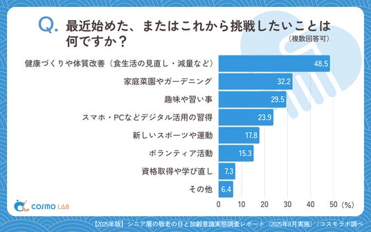 新しい挑戦では「健康づくりや体質改善(食生活の見直し・減量など)」(48.5%)が最多で、「家庭菜園やガーデニング」(32.2%)や、「スマホ・PCなどデジタル活用の習得」(23.9%)が続き、健康志向と新技術への適応意欲が併存しています。