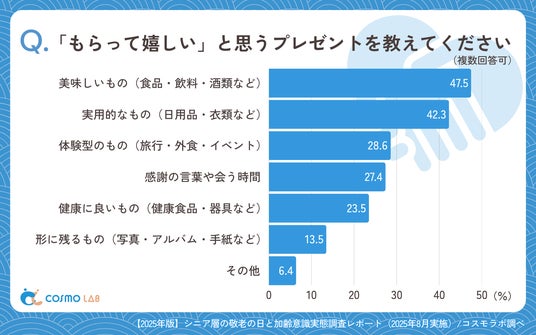 喜ばれるプレゼントとして、「美味しいもの(食品・飲料・酒類など)」(47.5%)と「実用的なもの(日用品・衣類など)」(42.3%)が上位を占めています。シニア世代は形式的な贈り物よりも、日常生活で活用できる実用性や、食事を通じた楽しみといった体験的価値を重視する傾向が明確に表れています。