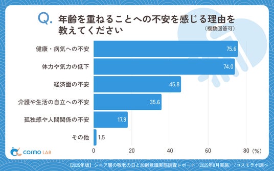 「健康・病気への不安」(75.6%)と「体力や気力の低下」(74.0%)が突出して高く、「経済面の不安」(45.8%)や、「介護や生活の自立への不安」(35.6%)、「孤独感や人間関係の不安」(17.9%)が続きます。健康と体力の不安が圧倒的に高い結果は、シニア世代にとって身体的な機能維持が最重要課題であることを明確に示しています。