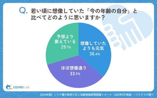 「想像していたよりも元気」(36.4%)が最多で、「ほぼ想像通り」(33.9%)、「予想より衰えている」(29.7%)と三分されています。予想以上に元気であると感じるシニアが最も多い結果は、医療技術の進歩や健康意識の向上、生活環境の改善などにより、実際の加齢体験が従来のイメージよりもポジティブになっていることを示しています。