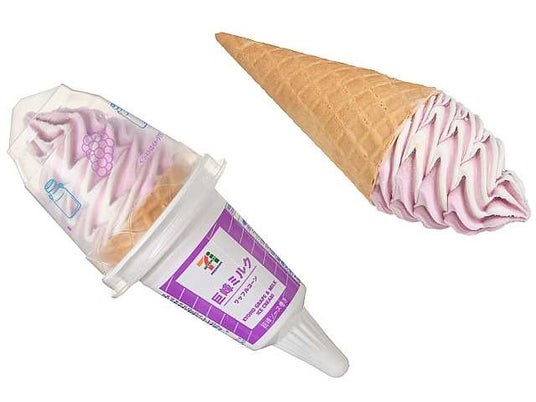 芳醇な香りが広がる巨峰アイスと、生乳のコクを堪能できるリッチミルクアイスを絶妙なバランスで組み合わせました。さらに、2色のアイスに巨峰ソースを同時に巻き上げることで、巨峰の豊かな風味をより一層引き立てています。