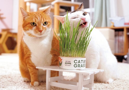 【5月の写真】猫草に狂喜して独り占めするポンちゃんに、ドン引きのナナちゃん